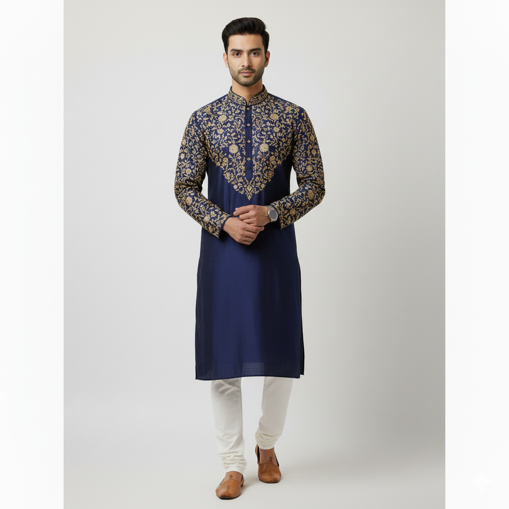 Crafted from a premium silk blend, this Panjabi features intricate high-stitch embroidery with dense motifs and a detailed neckline. Designed for Eid and special occasions, it delivers a rich, elegant finish with a refined modern fit.